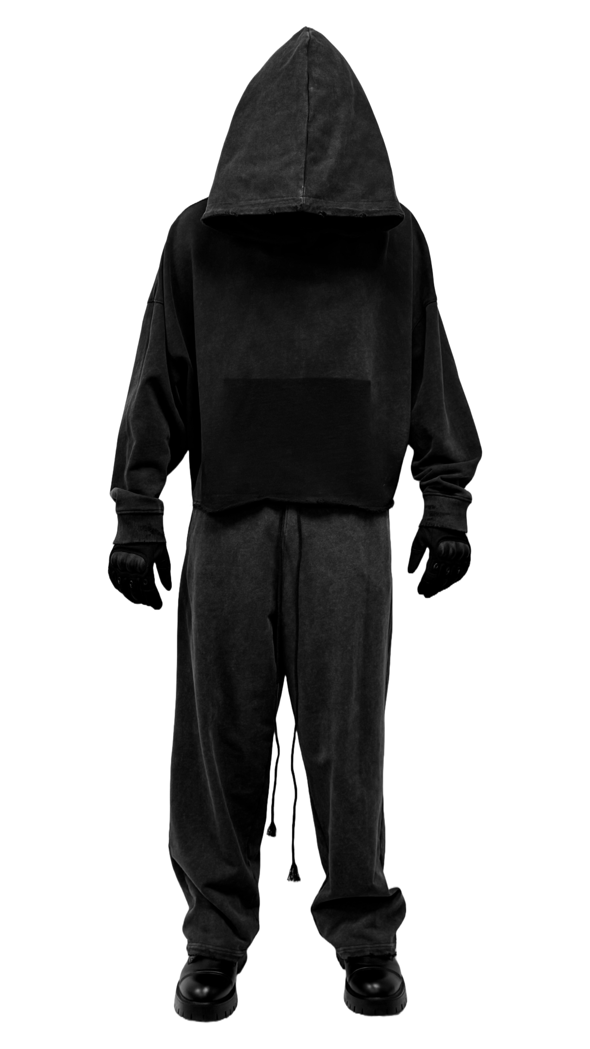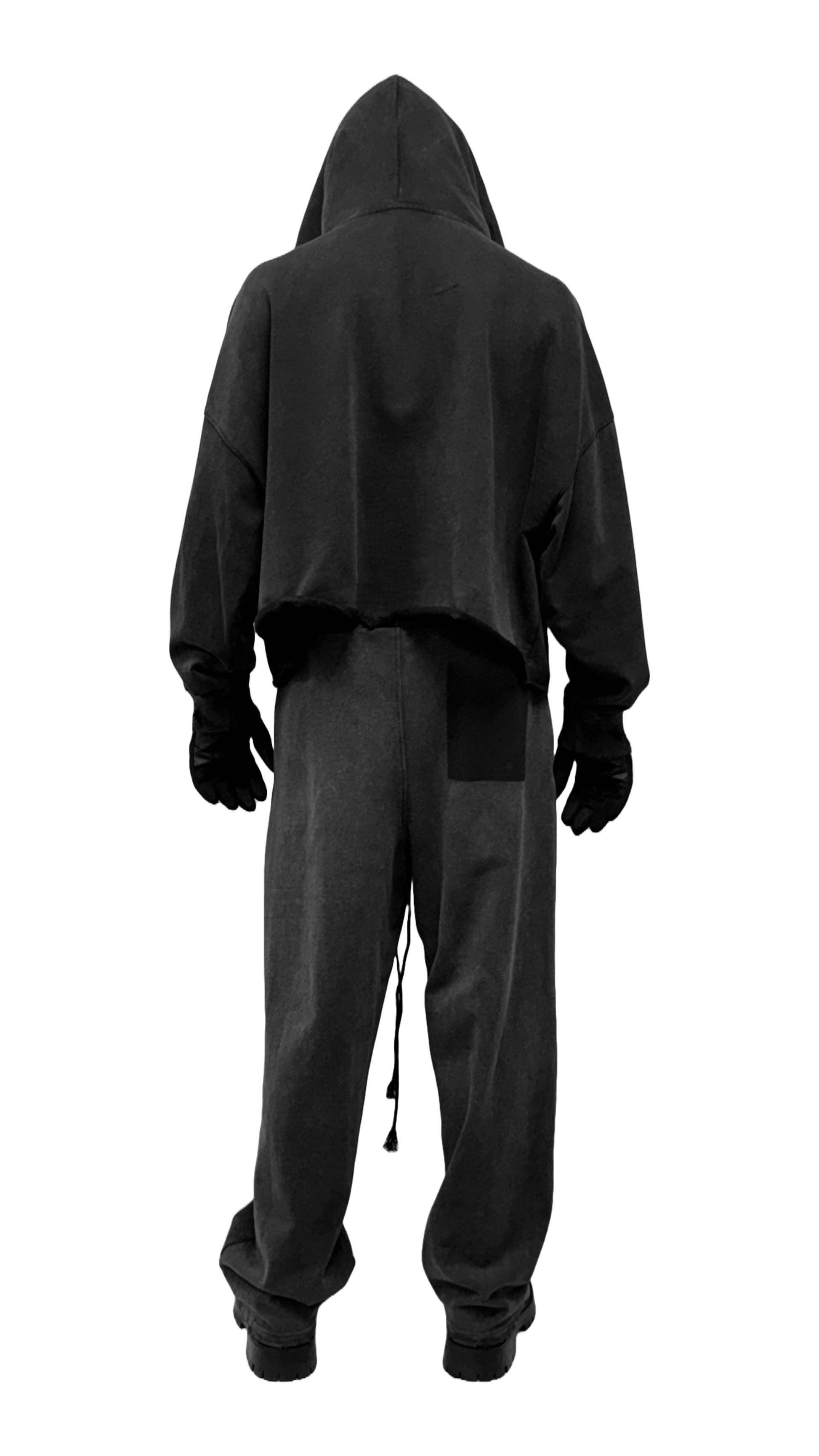 THE HOODIE IS MADE FROM HEAVYWEIGHT FRENCH TERRY COTTON AND STONE WASHED. THE SILHOUETTE IS WIDE AND CROPPED, WITH AN OVERSIZED HOOD. LIGHT DISTRESSING IS APPLIED TO THE WRIST CUFFS AND THE HOOD. THE FRONT KANGAROO POCKET IS MISSING. THE WRIST CUFFS ARE RIBBED BUT LOOSE, AND THE WAISTBAND MISSING LEAVING A RAW HEM.