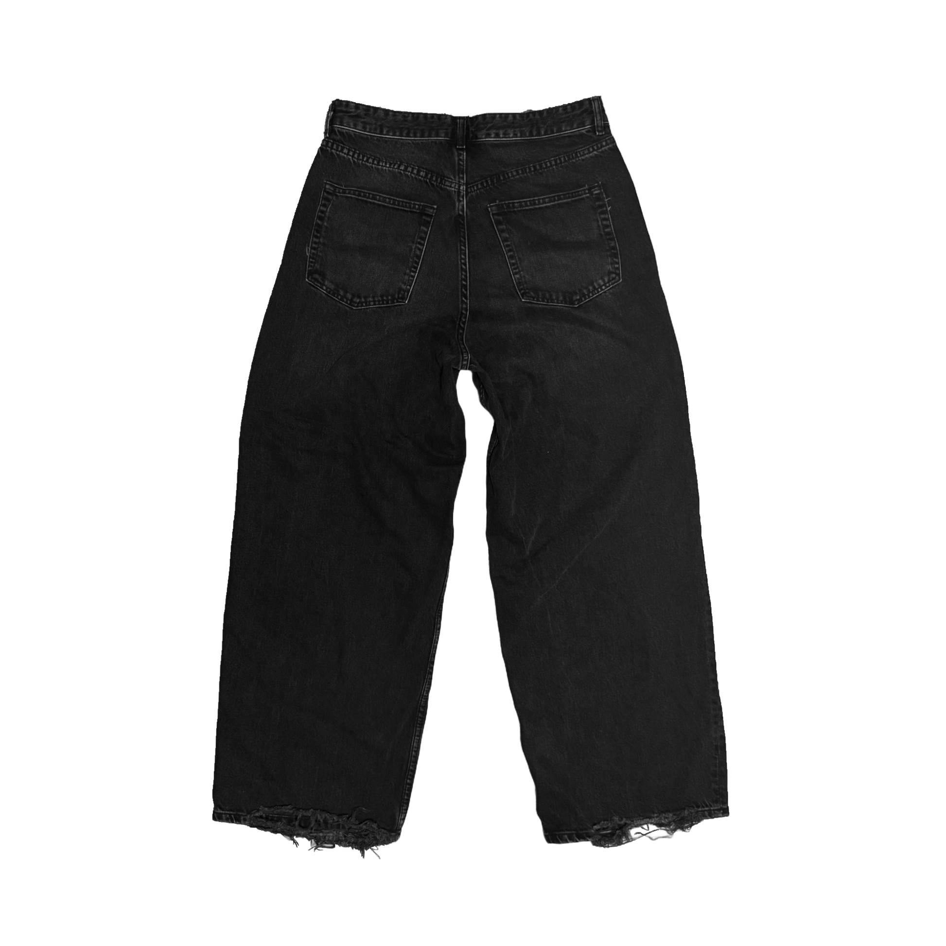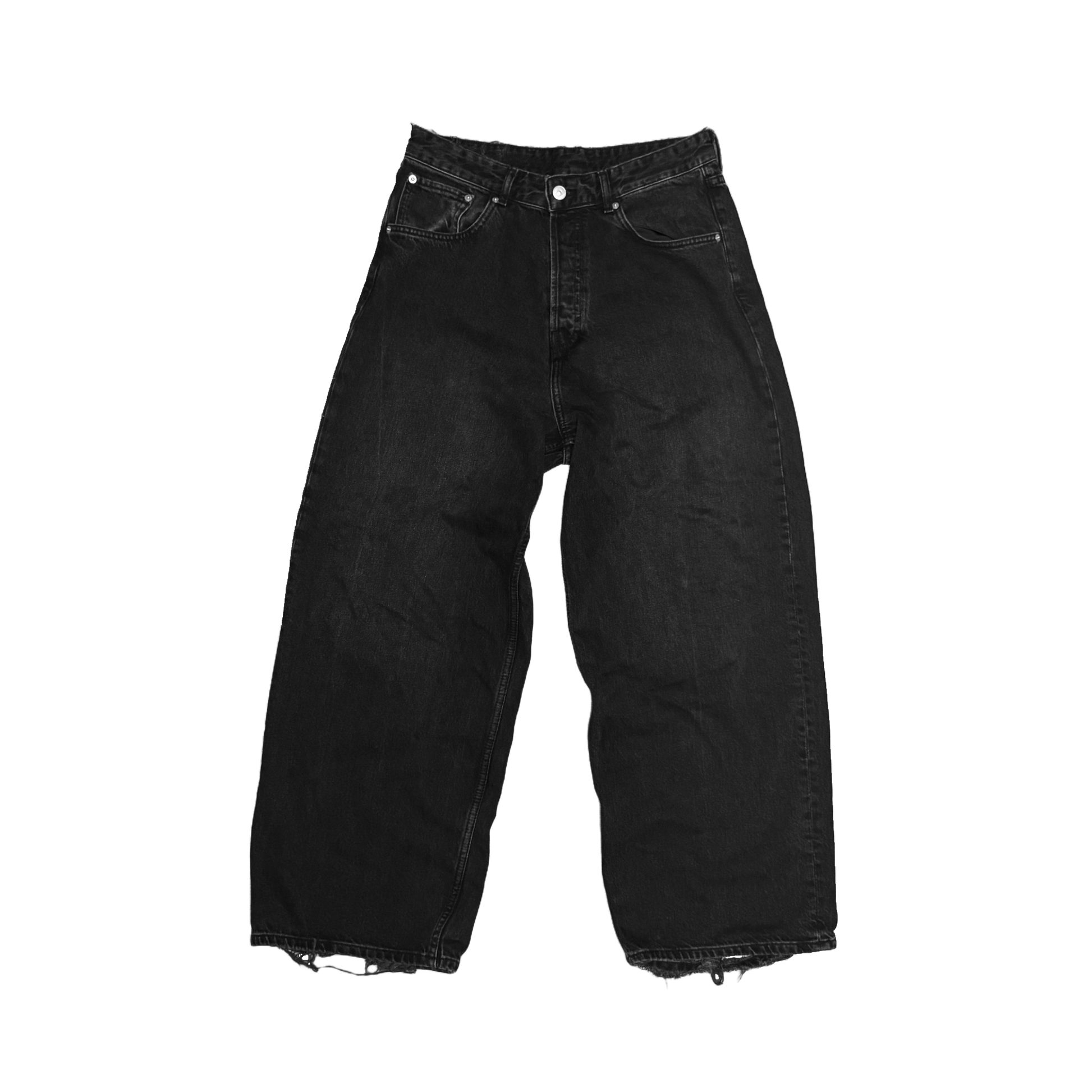 Oversized baggy jeans cut from mid-weight black denim. Garment dyed for a faded black finish. A button fly secures the front. Frayed waistband. Shredded hems at the heel expose the raw weave.